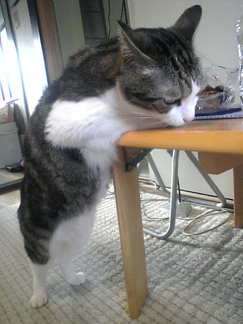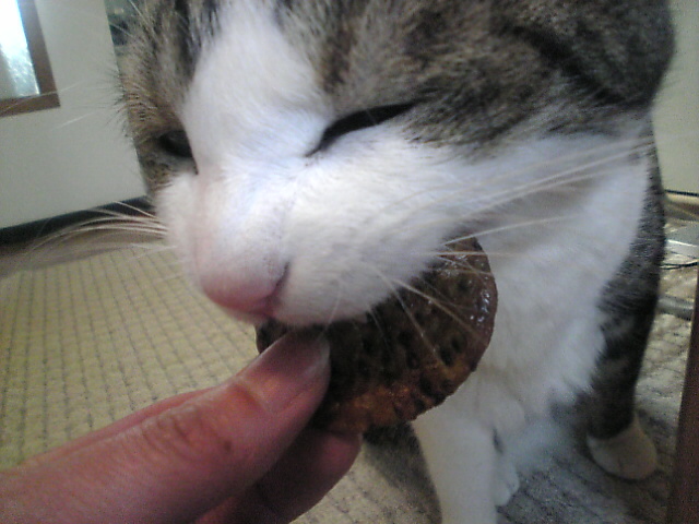 ある休日の午後 チョコパイを食べるタカちんに近寄る猫達・・・ チチ) クンクン。。。これは食べられニャイにゃぁ み) どれどれ? ぼくもためちてみる! クンクン・・・しょうだねェ~ そして、次に、お煎餅を食べ始めたタカちんに 近寄る猫・・・