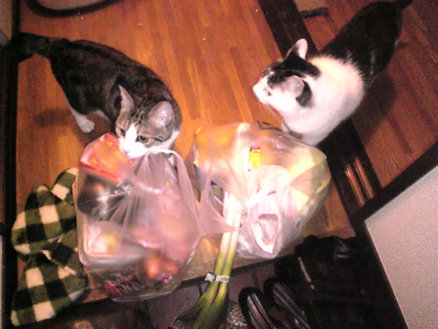 買い物袋から離れない猫2匹.。o○