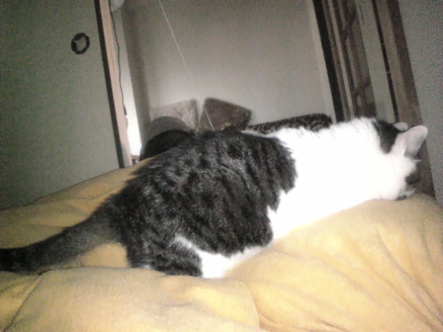 寝ているタカちんに容赦無く上に乗る猫 彼の名前はチチくん・・・ そして足元には 彼の名前はみーたん・・・ 何でこういう時こそ寝かせてくれないのでしょw そして、この後みーたんは布団の中に 暫くすると 左;チチくん 右;みーたん チチくんとみーたんで襲ってくる チチ「タカちんニャンで寝てるのだ?(ペロペロ~)」 み「しょーだしょーだ!ニャンで?おちごとは?」 下がるものも下がりませんが Σ( ̄ε ̄;)!!