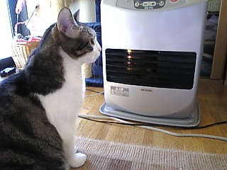陽の光を求めて家の中をさまよう猫が1匹 そして、ヒーターの前では 朝は寒いのでヒーターを点けるのですが タカは全然暖かくありません タカ) あのぅ・・・ どいて頂けませんか? ホットカーペットも全面にしてあるから どこでも暖かいでしょ? み) 暖かい風が心地良いニャア~ん でも、かわいしょうだから、どいてあげる